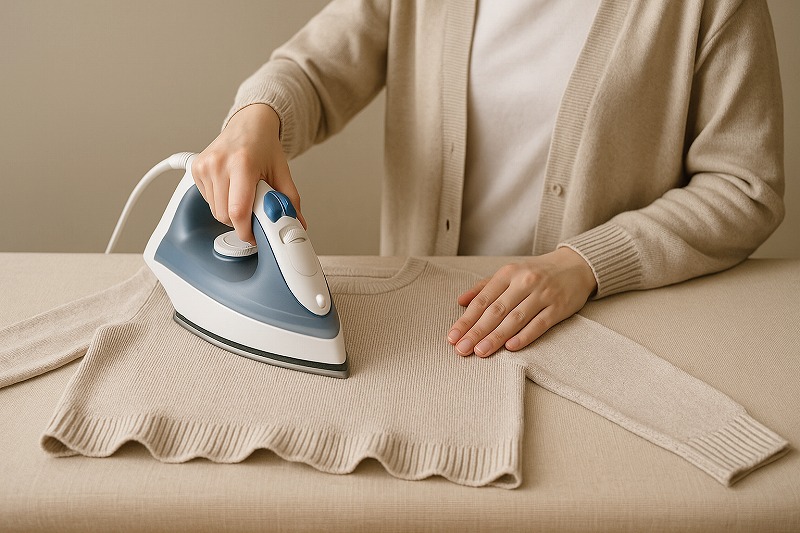 あて布をして、低温で優しくアイロンをかけるのが基本です。アイロンの温度は必ず「ウール」や「低温」設定にし、強く押さえつけないように注意しましょう。