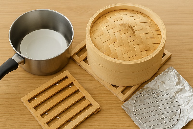 さらに、陶器製のスープボウルや耐熱ガラスの容器を使って高さを出す方法もあり、蒸気の通り道を工夫すればしっかり代用できます。普段あまり使わない調理器具を活用すれば、買い足し不要で試せる点が魅力です。
